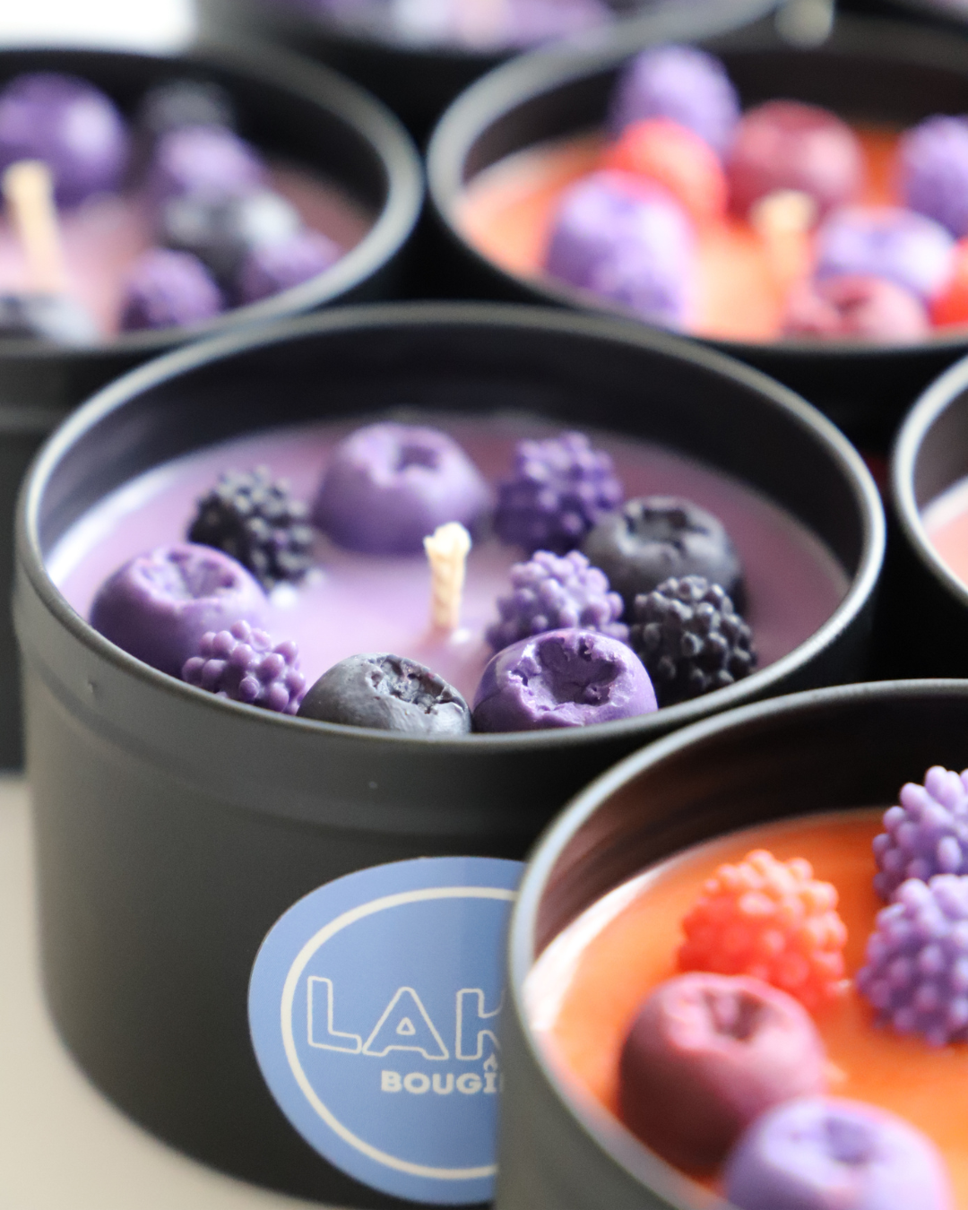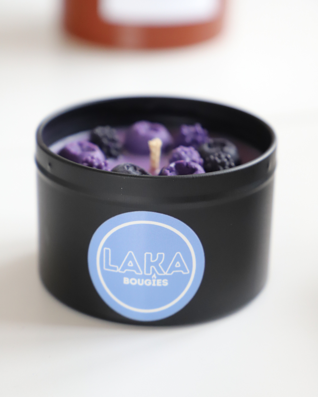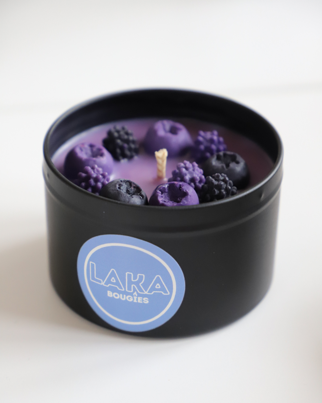 Découvrez cette bougie en pot métallique noir, parfumée aux notes délicates de mûre et myrtille, élaborée à  Saint-Maur des Fossés avec du parfum de Grasse sans substances CMR ni phtalates.