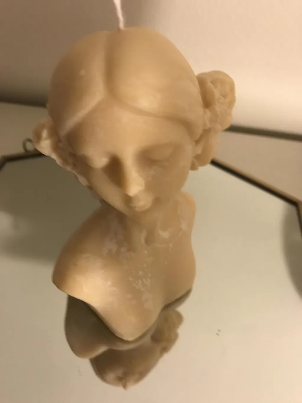 La couleur de la bougie n’est pas uniforme il y a des taches blanchâtres sur le buste et dommage qu’il n’existe pas un modèle plus grand..