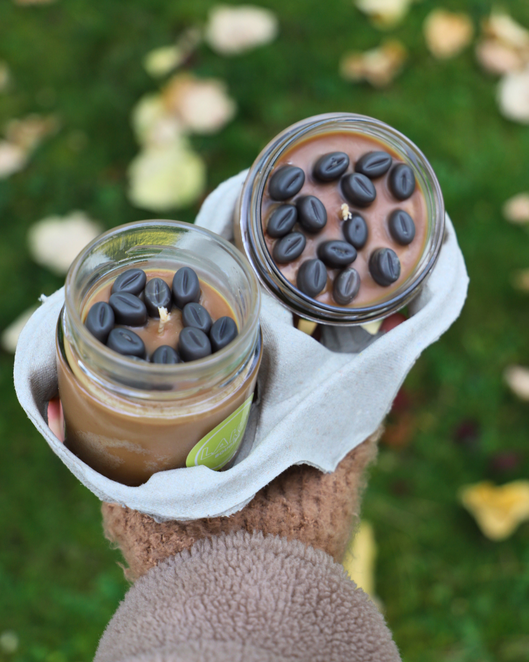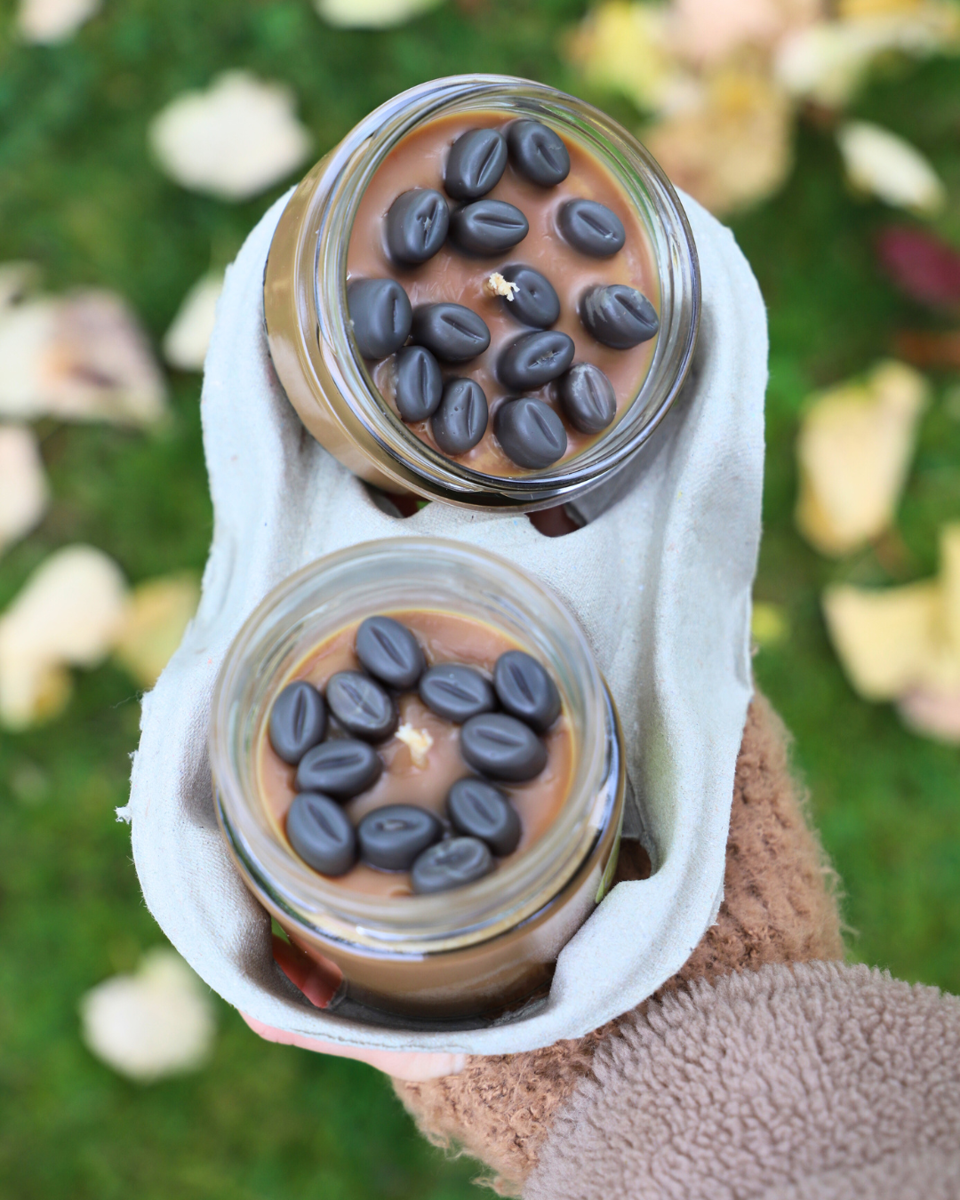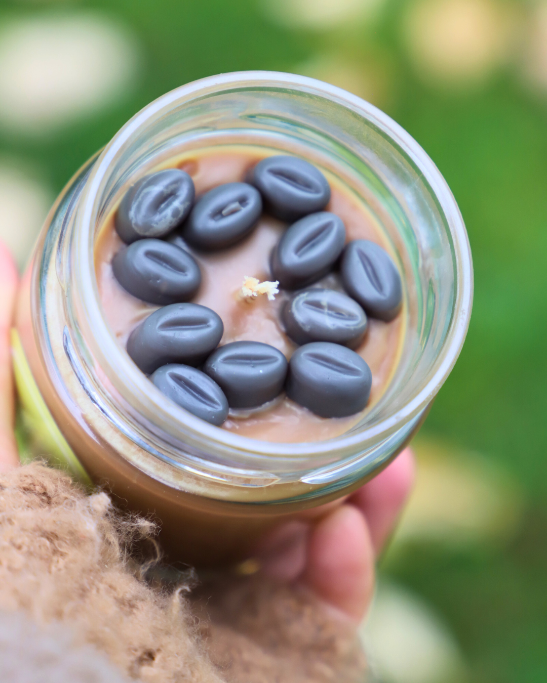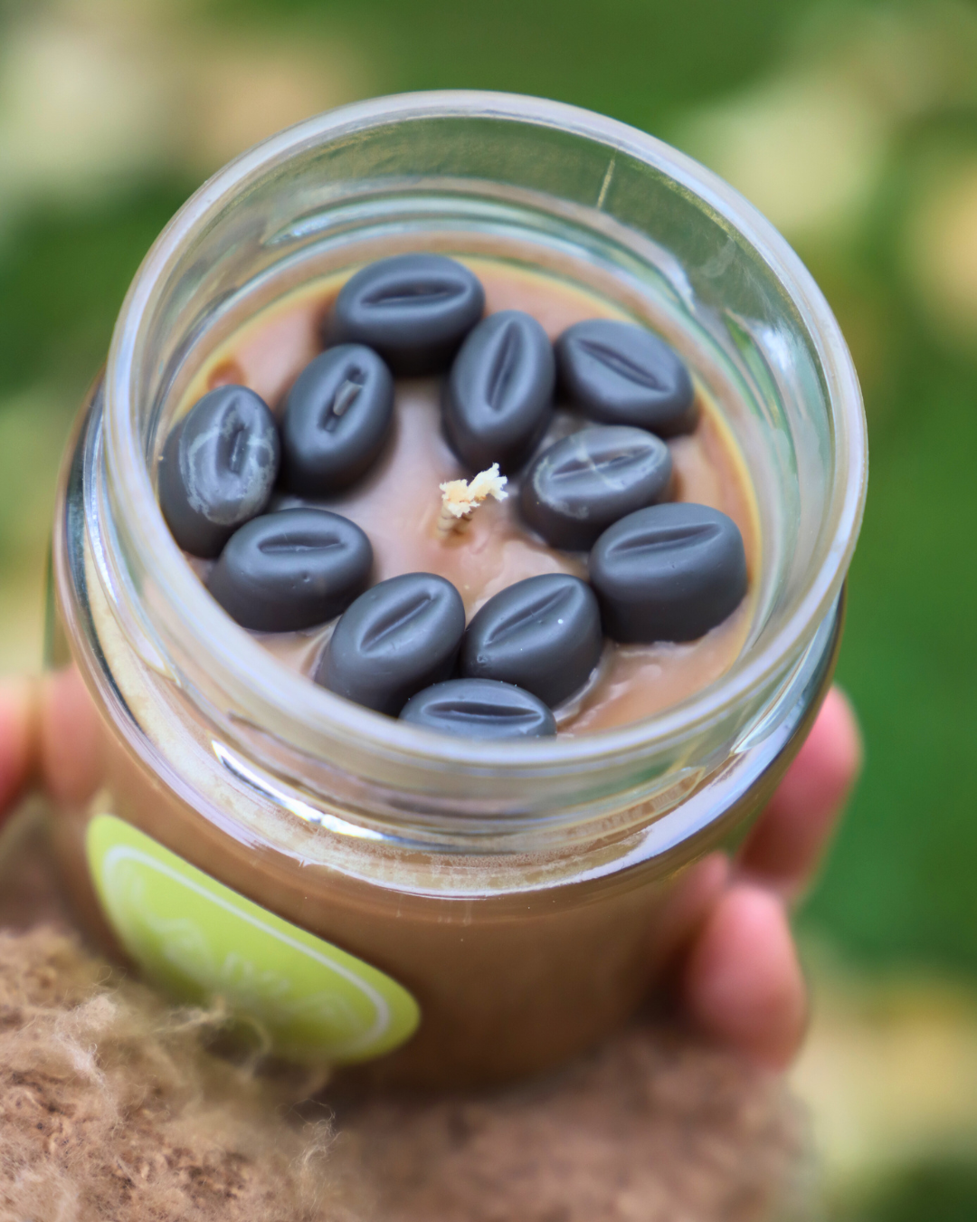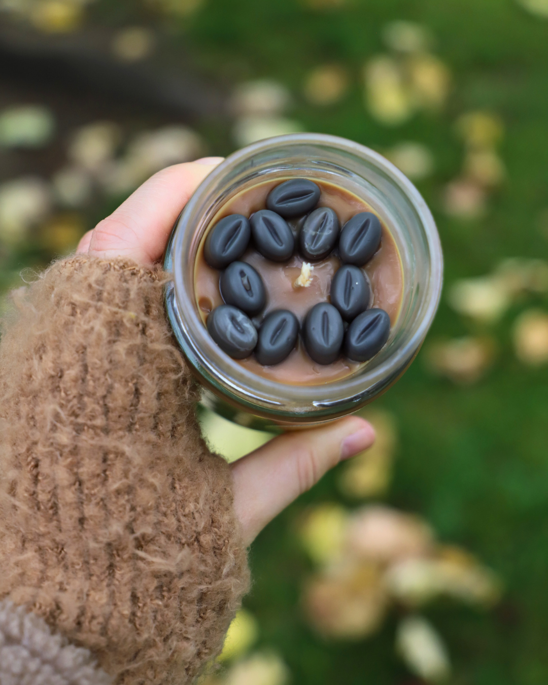 Les grains de café en cire intégrés au pot prolongent l'expérience visuelle et olfactive, créant une décoration élégante et thématique.