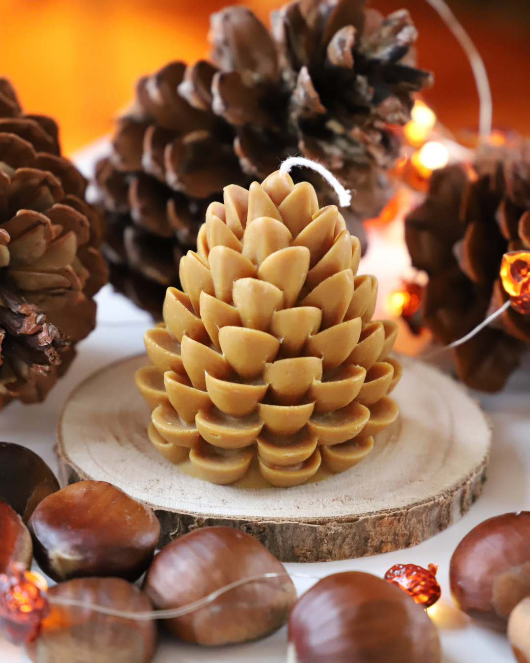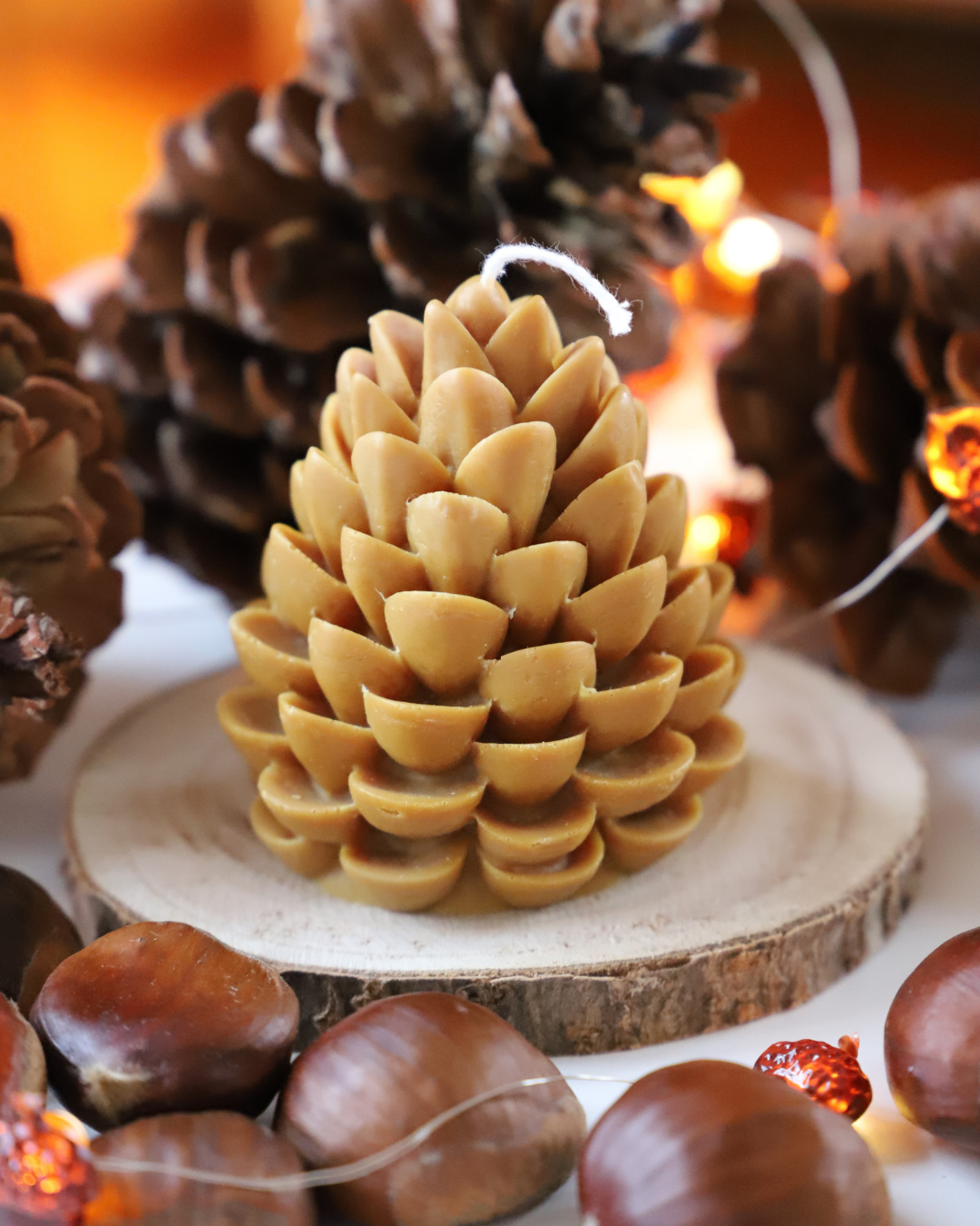 Découvrez la bougie Pomme de Pin, une création artisanale qui capture l'essence des saisons froides.