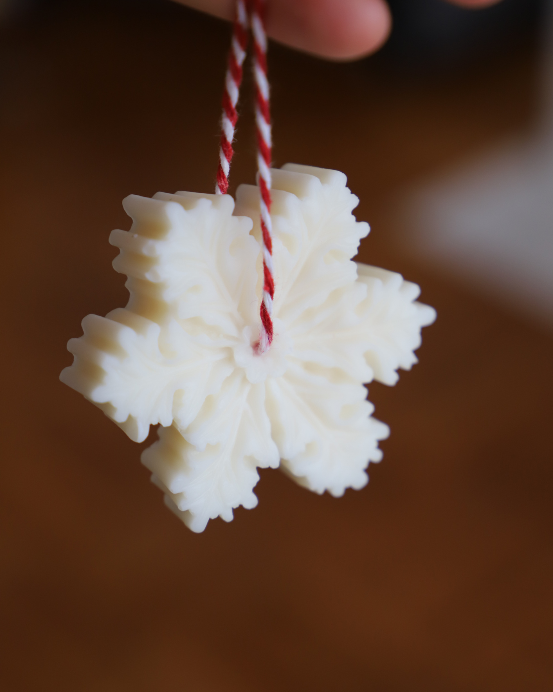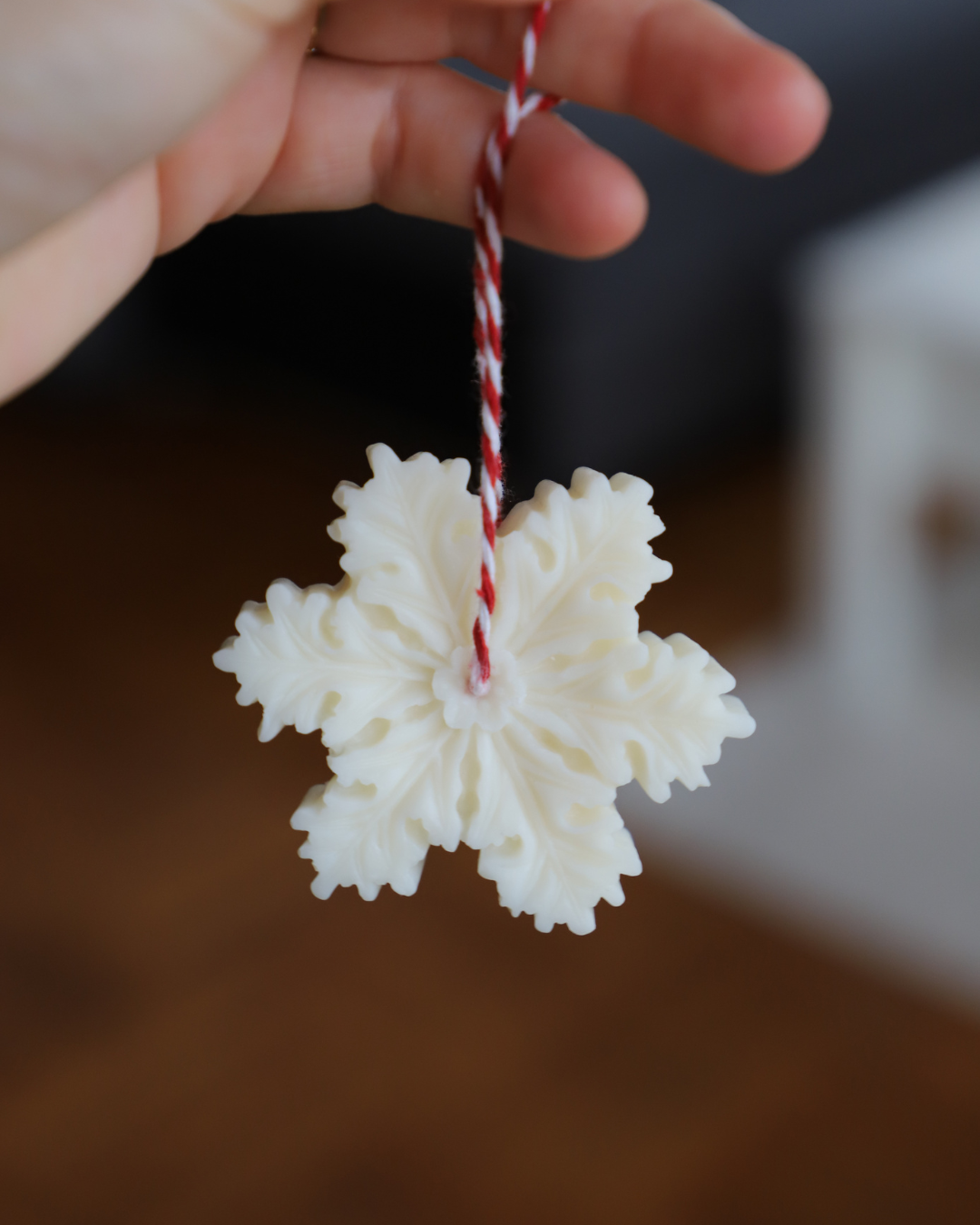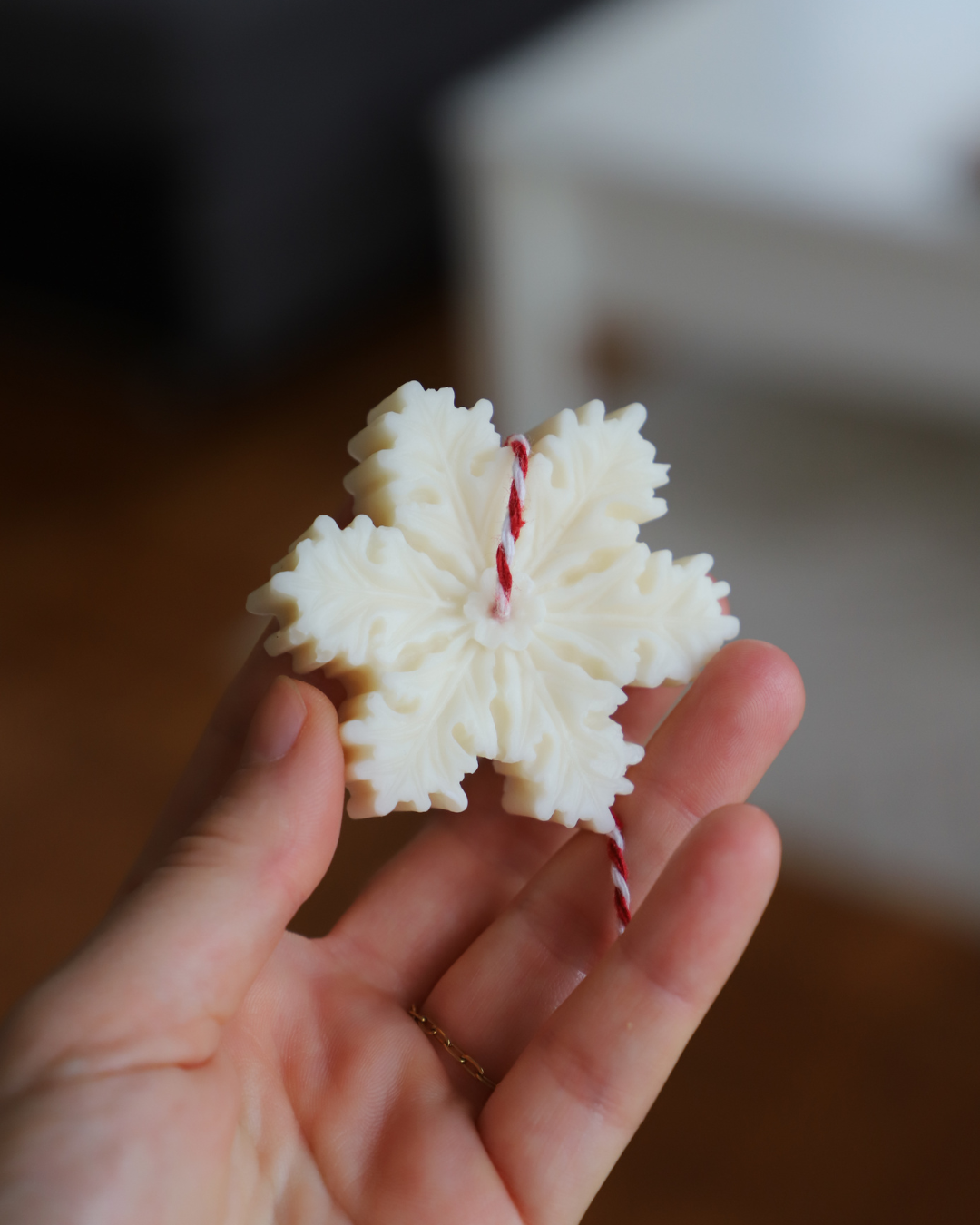 Suspensions de noël en forme de flocon. Quelques parfums de Noël mais toujours la possibilité également de choisir les parfums habituels sur le site internet pour personnaliser votre bougie jusqu'au bout.